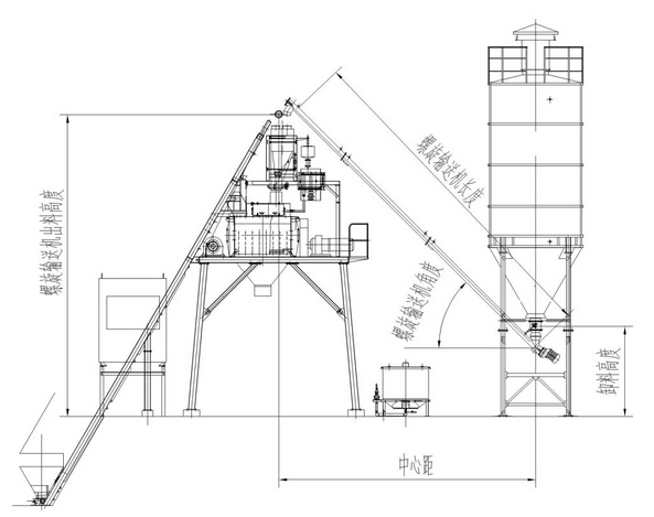 在安裝方面螺旋輸送機常規(guī)出廠長度為6M、9M、12M三種,角度一般在30~60度為佳。通過簡單的數(shù)學計算方可得出散裝水泥罐卸料高度,如下圖: