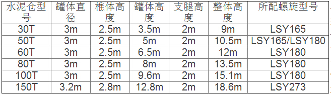 水泥倉市場上規(guī)格較多,不同的規(guī)格其罐體的高度、支架的高度以及罐體的直徑等都有所變化。以下是常見的水泥倉規(guī)格:
